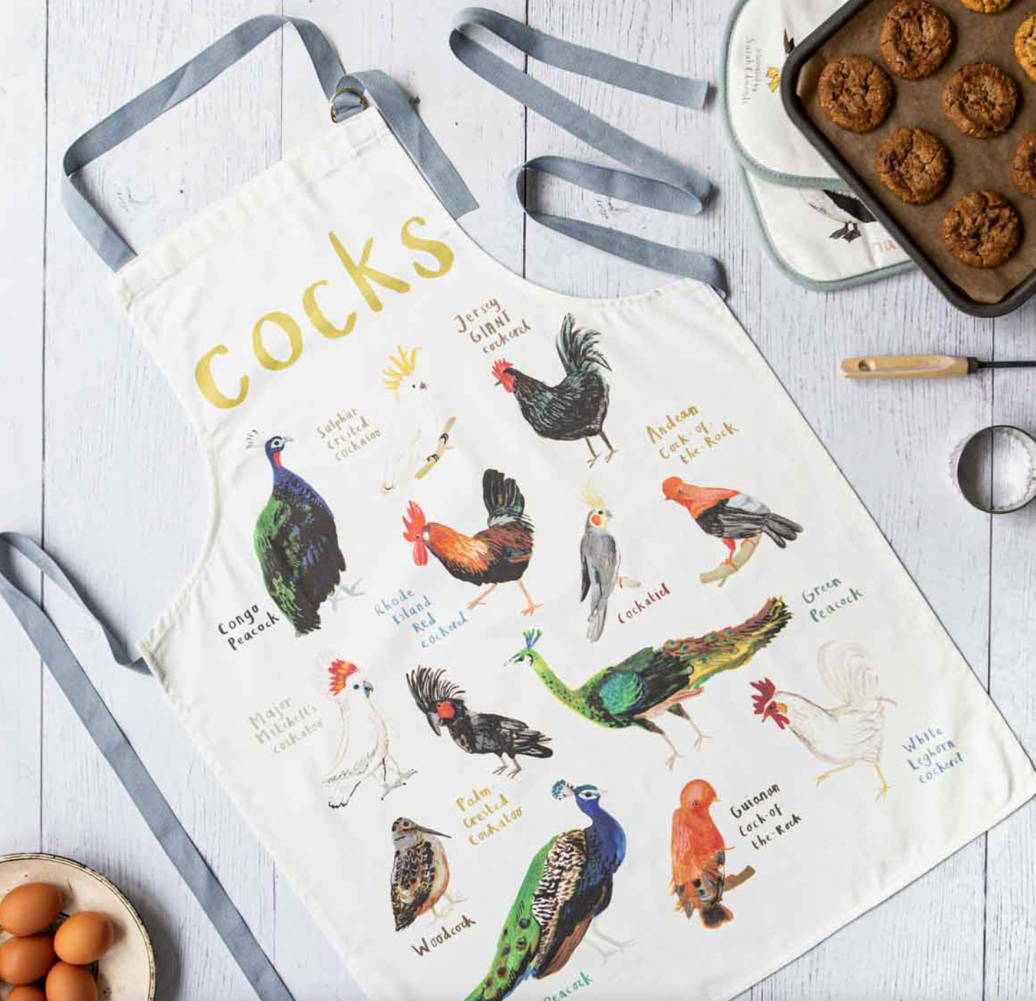 Raise the kitchen roof with laughter wearing the playful Cocks Apron by Sarah Edmonds Illustration. Featuring vibrant, cheeky images of colourful cockerels, peacocks, and cockatoos from around the world, this apron turns cooking into an artful, fun experience. Soft dawn grey adjustable neck and waist ties ensure a comfy fit, while the olive green belly band adds a stylish touch. Perfect for bird lovers who enjoy baking with a side of banter. Sized approximately 85cm by 60cm, it’s a lively and unique gift that brightens any kitchen moment.
