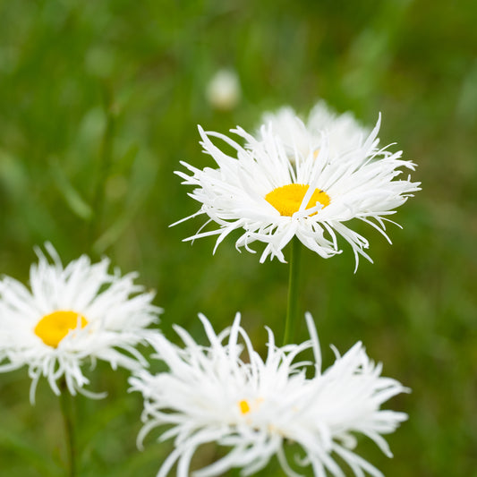 Leucanthemum × superbum 'Shapcott Gossamer’, also know as Shasta Daisy, known for its finely cut, almost frilly white petals that float around golden-yellow centers. Flowers are held above toothed, green leaves.