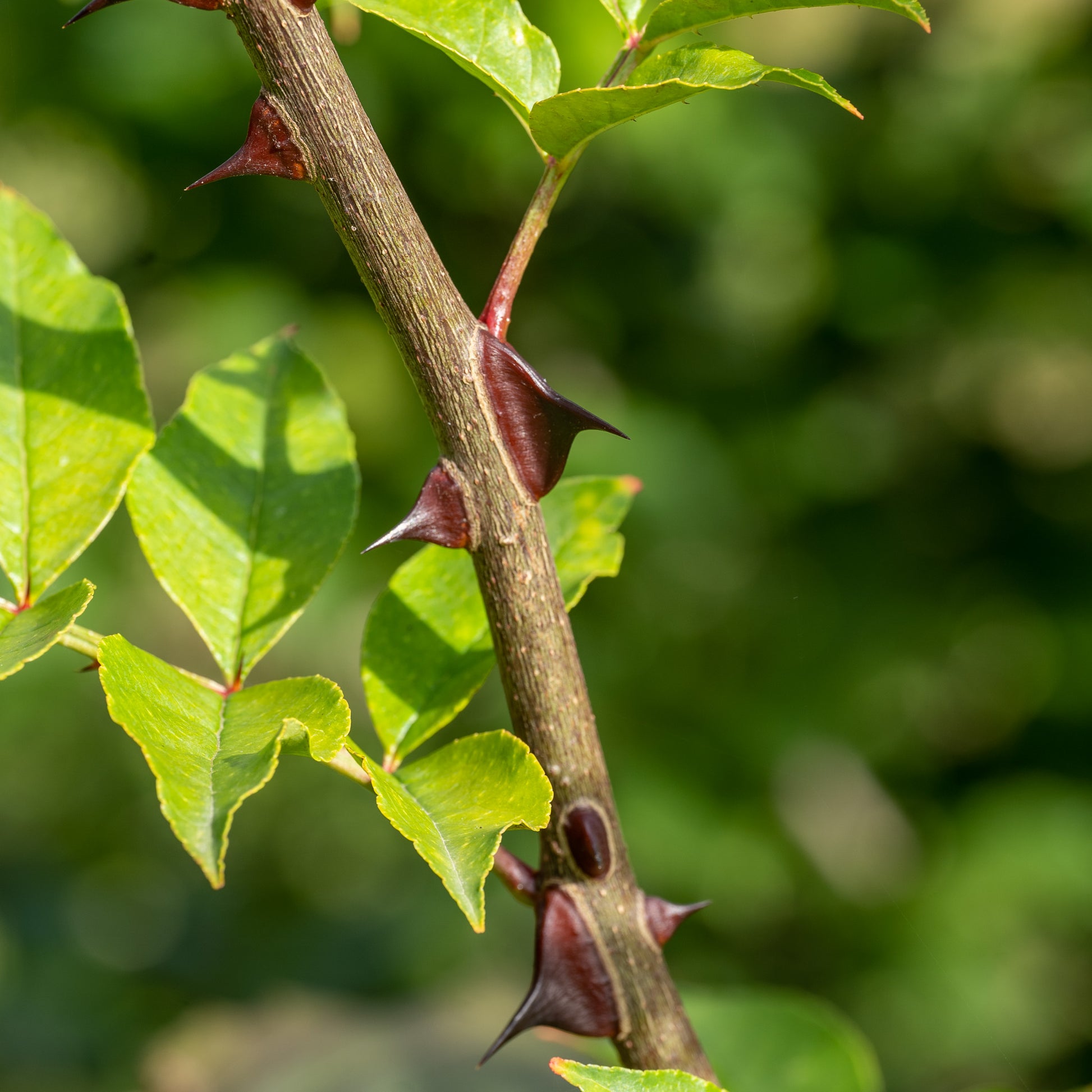 Zanthoxylum piperitum, the Szechuan pepper originates from mountainous regions of China and Japan. It is a hardy deciduous bushy shrub, which has vibrant glossy green leaves that turn yellow in the autumn. Sprays of yellow-green flowers form in the summer, which turn into small red fruit in the autumn, inside these are small black seeds that can be dried to make Szechuan sauce! The bark and leaves are pleasantly aromatic but be careful of the large sharp thorns covering the plant.